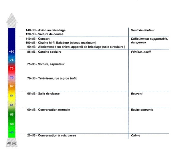 L'intensité d'un son ou d'un bruit est mesuré en décibels. On écrit cette unité dB parce qu'il s'agit de dixièmes de bel. L'échelle de bruits courants (ci-dessous) permet de classer tous les bruits selon leur intensité. Il existe une formule pour calculer le nombre de décibels en fonction de la puissance.