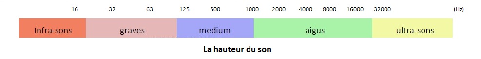 Définition physique de la Hauteur d'un son (ou fréquence sonore) : C'est l'audition de certaines fréquences par l'oreille. Elle est mesurée en Hertz mais peut être également mesurée en MEL, une unité moins connue mais ayant le même rôle que le Hertz. Une oreille humaine peut entendre de 20 à 20 000 Hz, en dessous de 20Hz nous trouvons le domaine des infra-sons (en rouge) alors qu'au delà de 20 000 Hz nous arrivons dans le domaine des ultra-sons (en jaune). En isolation acoustique les fréquences vont généralement de 100 à 5 000 Hz.