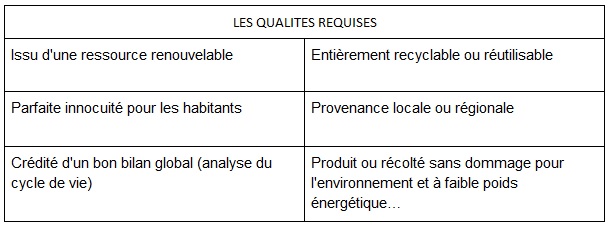 Généralement un matériau écologique doit respecter les caractéristiques suivantes, ce matériau, idéalisé, est difficile à concevoir et on devra donc faire des compromis.